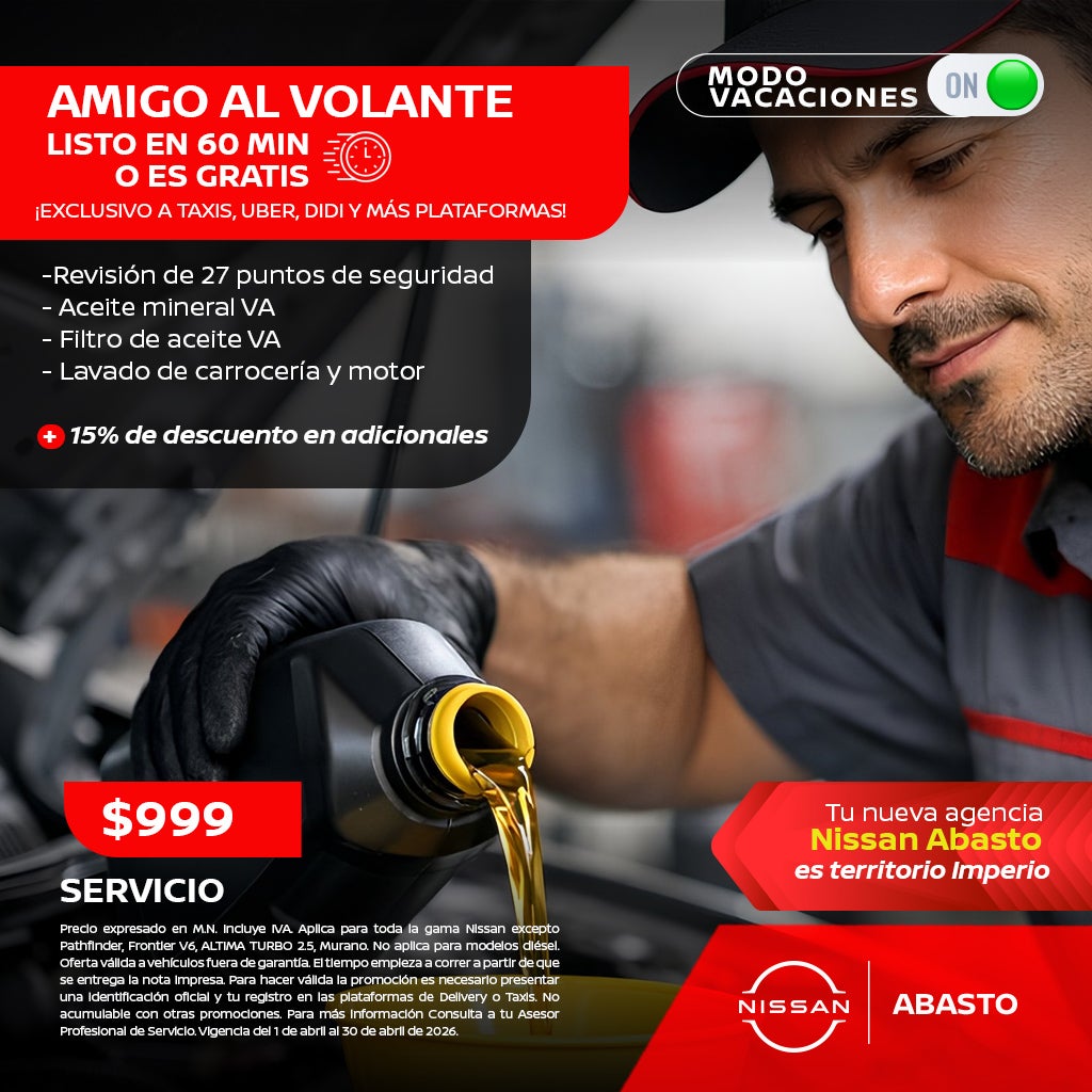 Precio expresado en M.N. Incluye IVA. Aplica para toda la gama Nissan. Para más información consulta a tu Asesor Profesional de Servicio y Refacciones. Vigencia del 1 al 30 de Abril 2026.